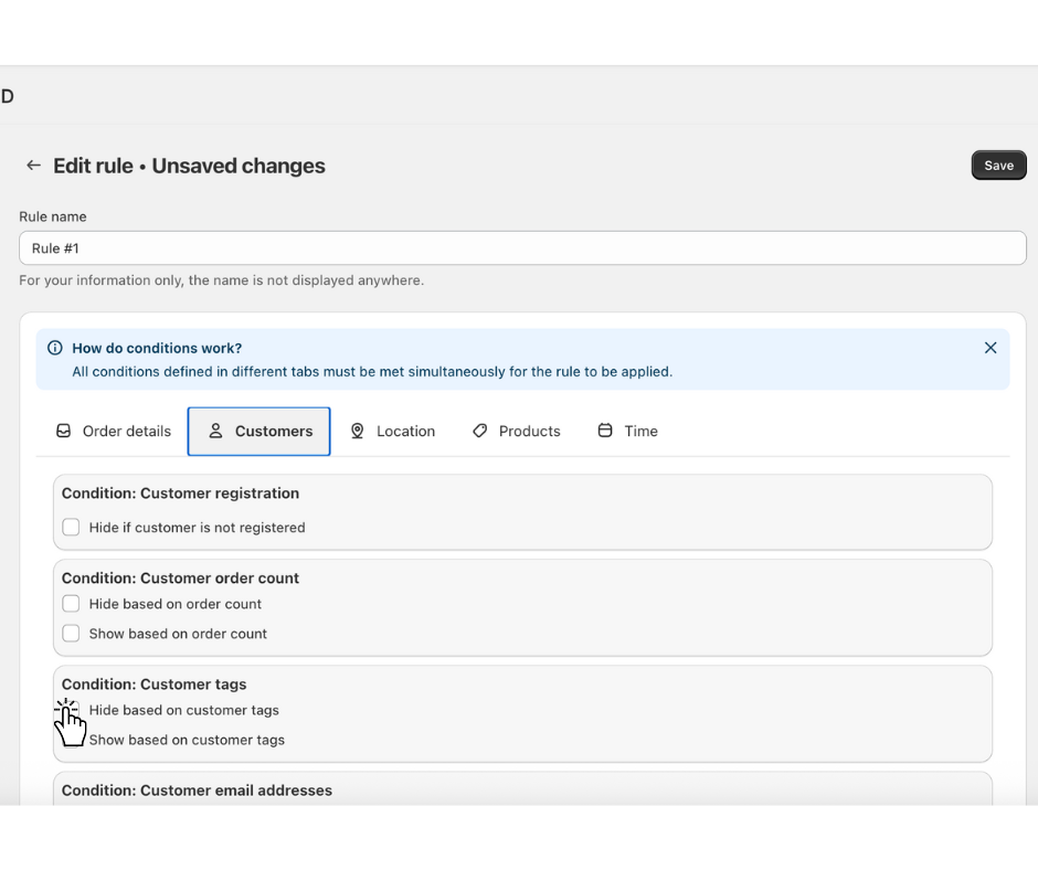 > Tip: You can use the “Show based on customer tags” option to do the opposite. For example, you could create a special shipping rate and make it visible only to customers with the "VIP" tag.
