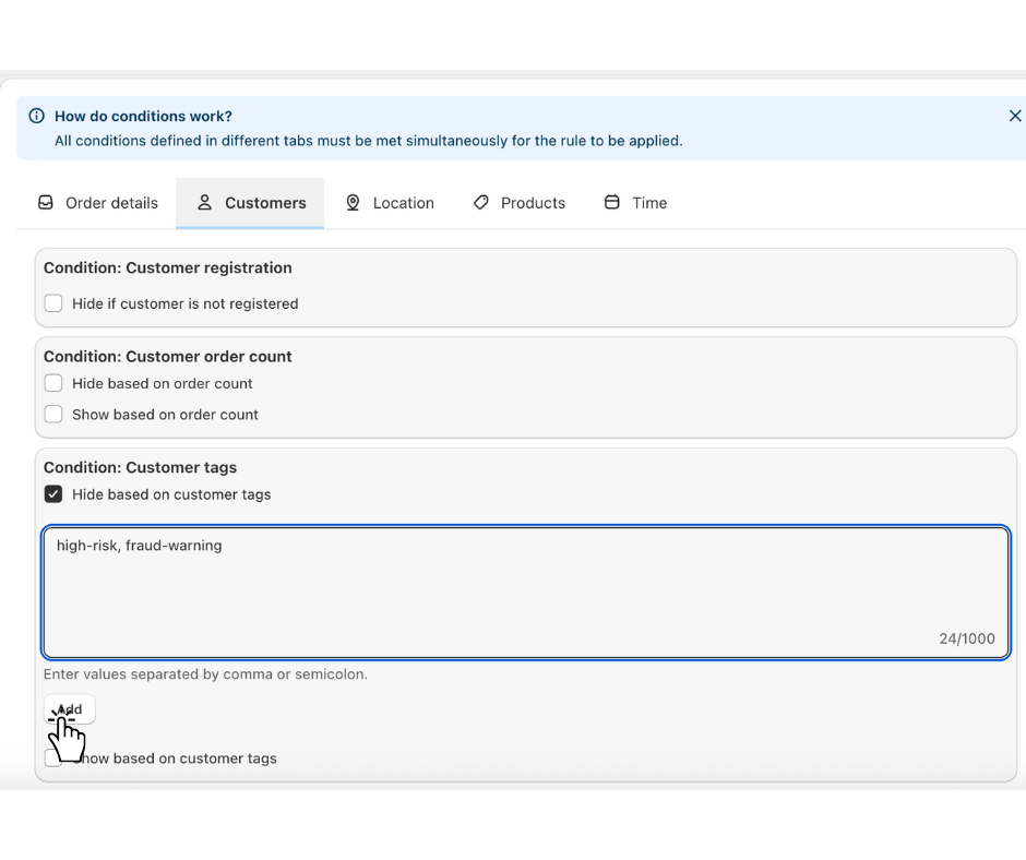 Imagine you want to prevent customers you've tagged as "high-risk" from selecting the COD option.