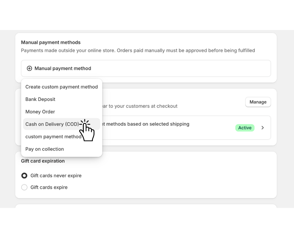 Scroll down to the Manual payment methods section. Click the "Add manual payment method" dropdown and select Cash on Delivery (COD).