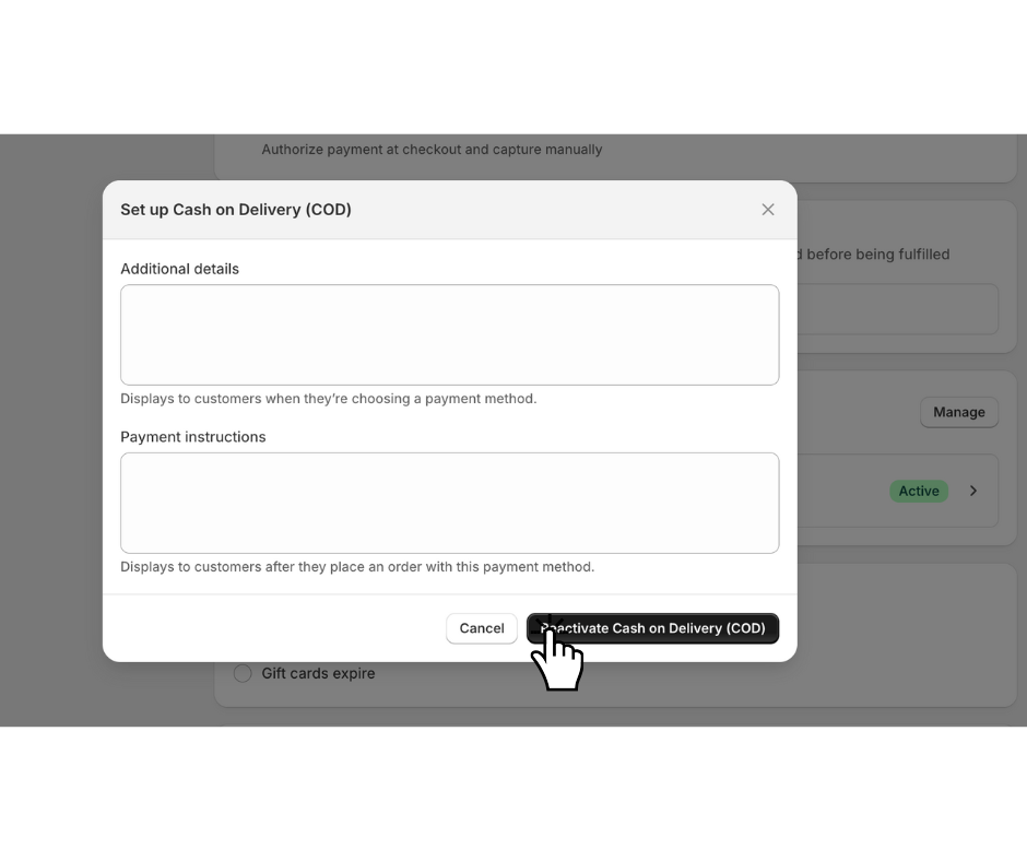 Before you can use our app to manage COD fees or set visibility rules, you first need to activate the "Cash on Delivery" payment option directly in your Shopify settings.