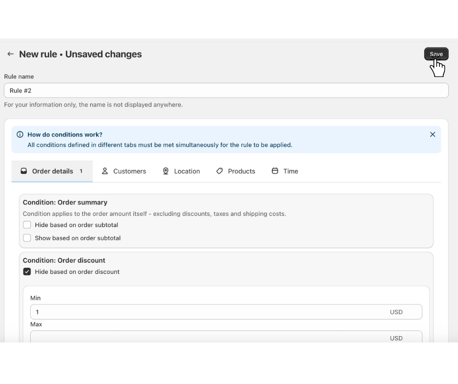 That's it! Your Cash on Delivery shipping rate will now be intelligently hidden at checkout whenever a customer's order includes a discount that matches your rule.