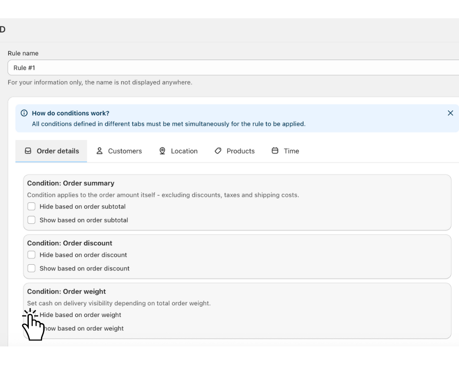 That's it! Your Cash on Delivery shipping rate will now be intelligently hidden at checkout whenever an order's total weight matches the rule you've created.