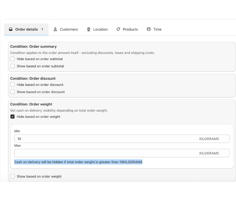 The weight of an order can significantly impact shipping costs and logistics. You might want to prevent certain shipping options, especially those with COD fees, from being used for orders that are either too heavy or exceptionally light.