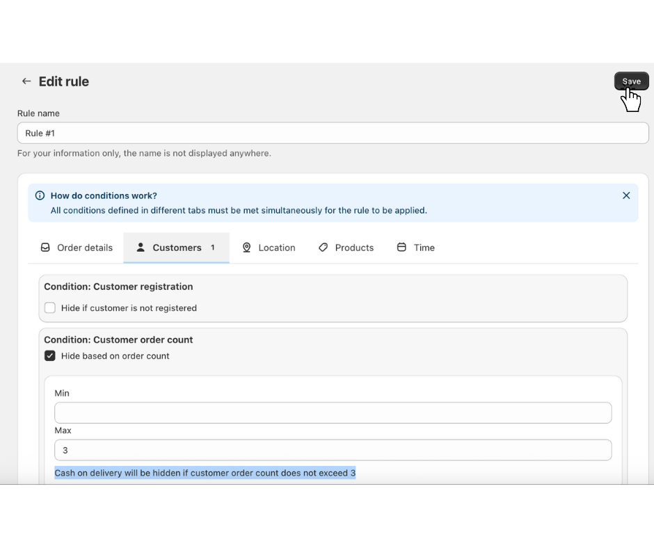 Example: Hide the COD shipping option for customers with more than 3 orders.